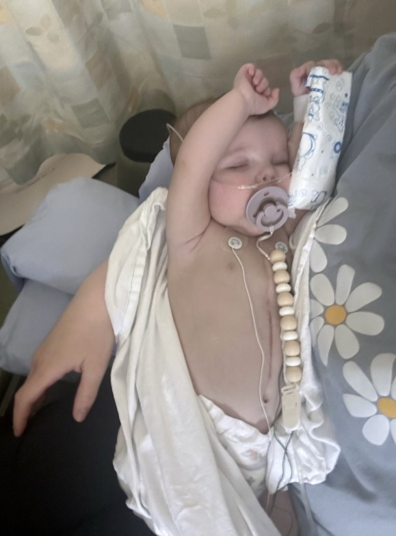 We had a good first evening at home with her until the following night when things took a turn for the worse. Brynlee became extremely agitated and unable to settle no matter what we tried. The following morning, we took Brynlee back for another routine cardiologist checkup and Dallas and I began to cry to our team as it became clear that something was wrong with our daughter. She seemed to be in an extreme amount of pain and was readmitted. The Stollery team ran all the tests that they could at the time, and nothing came back as alarming. Three days later when they went to remove her sutures from her chest, her skin and breastbone fell completely open. Brynlee had to be rushed in for an emergency surgery that evening as the chest wires that held her breastbone together failed to heal, and she suffered a minor chest infection due to equipment failure. Thankfully she recovered well from the surgery and her chest started to heal properly.