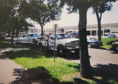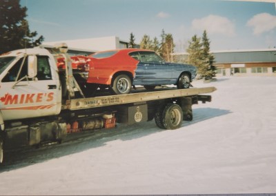 In the year 1983 Dad had a dream to start his own towing company. Mike’s Towing was born. He had about 6 different trucks running. Starting with one truck of course, it wasn’t his color for sure, it was green. Then another truck, 1 ton, the green truck was painted white right away with red lettering. The business cards were printed, with a 23 1/2 service. His business was growing, then more trucks, flat deck, came along which could pull 2 vehicles, he loved that, more money. He changed the color of some tow trucks red, with white lettering. He added more trucks, one, his pride and joy was a blue and white 3 ton. Then he added a long-haul trailer for longer runs, more vehicles. He did get the city contract for 1 year. It was great for business. Another contract, Searail, was for the military. He would travel various places: Manitoba, Saskatchewan, Alberta, and British Columbia. He ran this business close to 30 years. hired friends and family. I worked there, my husband worked there, longtime friend Vince Fry, and many others. I couldn’t mention them all.